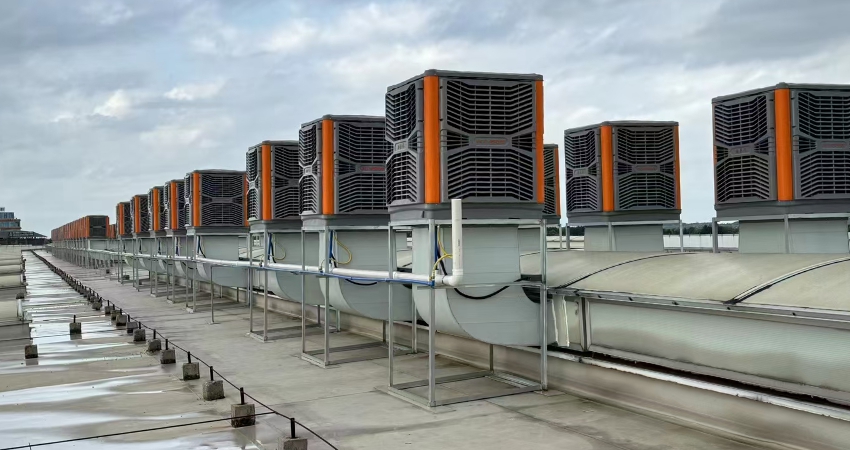 針對廠房的具體情況和降溫需求,我們精心設(shè)計(jì)了一套綜合性的降溫方案,主要采用蒸發(fā)式冷風(fēng)機(jī)結(jié)合工業(yè)大風(fēng)扇進(jìn)行扇機(jī)組合整體降溫。具體方案如下: