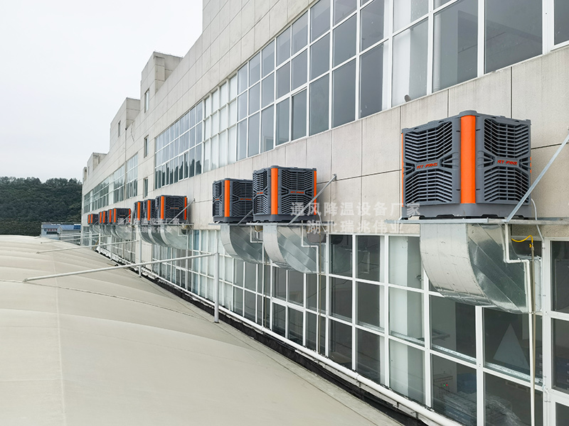 瑞泰風(fēng)RTF35型蒸發(fā)式冷氣機(jī)進(jìn)行送風(fēng)降溫、配套安裝12臺(tái)RTF-FF-1460型負(fù)壓風(fēng)機(jī)進(jìn)行通風(fēng)換氣。 蒸發(fā)式冷氣機(jī)以每小時(shí)980000立方米的送風(fēng)量,將室外新鮮空氣過(guò)濾、降溫后,源源不斷的送入車(chē)間內(nèi),負(fù)壓風(fēng)機(jī)則一起配合著,將室內(nèi)熱空氣源源不斷的抽排至室外。二者相互結(jié)合,有效利用,為廠房車(chē)間打造一種通風(fēng)、降溫、換氣、增加含氧量的良好工作環(huán)境。