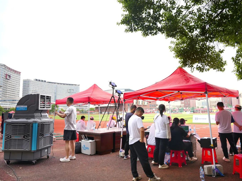 本次活動(dòng)期間,瑞泰風(fēng)經(jīng)過(guò)現(xiàn)場(chǎng)實(shí)地考察,科學(xué)規(guī)劃,一次性投放了30套移動(dòng)冷風(fēng)機(jī)設(shè)備,其中包括經(jīng)典版和體育版兩個(gè)系列產(chǎn)品,降溫效果顯著,安裝使用也非常便捷,確保各項(xiàng)室內(nèi)、戶外賽事活動(dòng)的順利開(kāi)展。移動(dòng)冷風(fēng)機(jī)是一款節(jié)能環(huán)保的降溫設(shè)備,尤其適合戶外使用,僅需2分鐘即可將35℃的高溫降低到26~27℃,達(dá)到人體最舒適,也是多類(lèi)體育項(xiàng)目最適宜的溫度環(huán)境。此外,移動(dòng)冷風(fēng)機(jī)送風(fēng)距離遠(yuǎn),覆蓋范圍廣,單臺(tái)設(shè)備的送風(fēng)距離可達(dá)30米,并且有效覆蓋120°扇形區(qū)域。