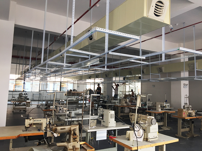 該品牌在全國有5個分廠進行生產(chǎn)。產(chǎn)量是跟上去了,人員一開始也較穩(wěn)定,但各車間仍面臨一個繞不過去的環(huán)境問題——車間為保障工人生產(chǎn)之通風(fēng)降溫難題—制衣車間滿滿的衣車發(fā)熱、密集的生產(chǎn)工人熨燙所揮發(fā)的蒸氣,加之夏季室外天氣本就炎熱。在試裝了一個分廠車間后,陸陸續(xù)續(xù)5個分廠車間全部裝上了環(huán)??照{(diào),化解了傳統(tǒng)風(fēng)扇沒有直接降溫效果,不合時宜,而中央空調(diào)初裝費用昂貴,運行費用高昂。因高溫所引起的招工留人的難題。該公司五個分廠總計安裝
