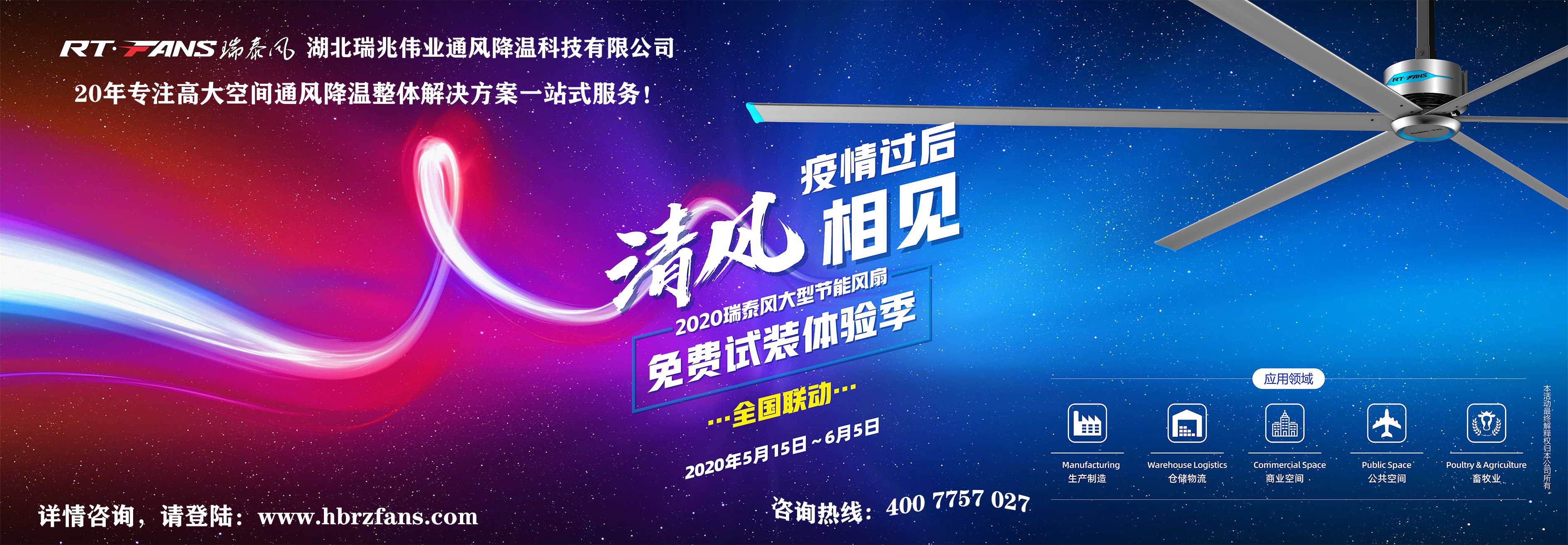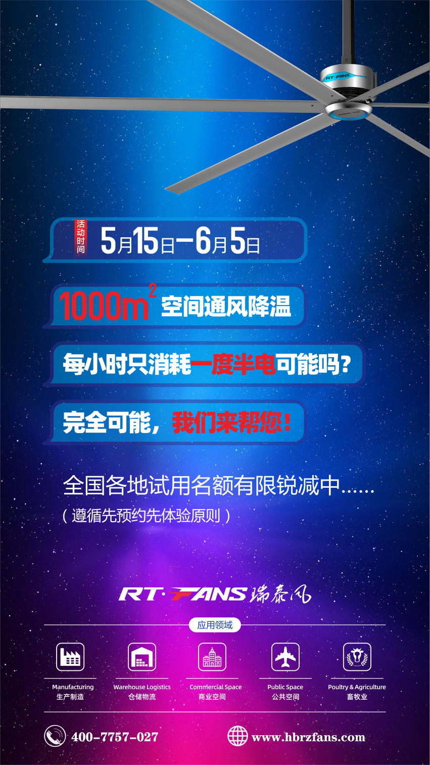 好消息!瑞泰風(fēng)工業(yè)大風(fēng)扇旺季銷售季來臨,為感恩回饋新老客戶,自5月15日~6月5日期間,隆重推出"瑞泰風(fēng)"工業(yè)大風(fēng)扇免費(fèi)試裝活動!