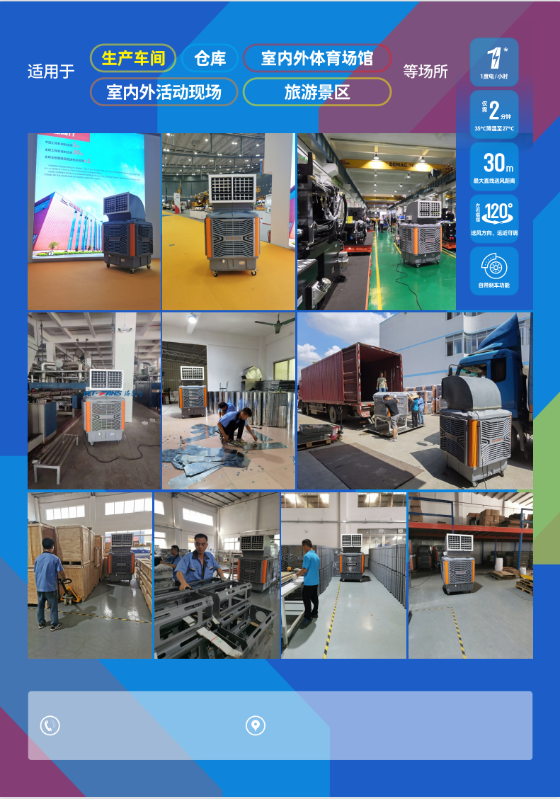蒸發(fā)式冷風(fēng)機投資少、效能大,在同等條件及面積安裝普通空調(diào)與冷風(fēng)機相比,冷風(fēng)機是中普通調(diào)總投資的1/5。耗電少、每小時用電僅1度,在同等面積安裝普通空調(diào)與冷風(fēng)機,耗電量只需普通空調(diào)的1/10。空氣質(zhì)量好“瑞泰風(fēng)“集通風(fēng)、換氣、除塵、降溫于一體,增加空間含氧量,提高工作效率,自然送風(fēng)或崗位送風(fēng)隨意選擇。降溫效果強在南方地區(qū),機器一般降溫能達到4℃-10℃的效果,在炎熱干燥地區(qū),機器降溫可達到4℃-15℃,并且降溫迅速。風(fēng)量大、送風(fēng)遠每小時大風(fēng)量為18000至60000立方米,可根據(jù)客戶要求選取,我們的機器風(fēng)壓大、送風(fēng)遠。