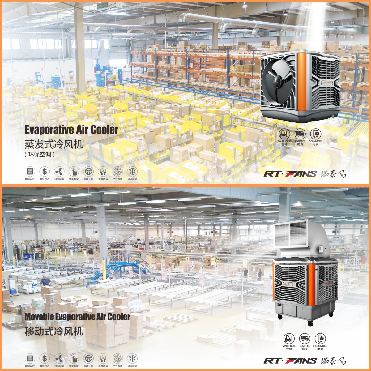 2. 蒸發(fā)式冷風機(環(huán)??照{) 根據(jù)水蒸發(fā)吸熱原理,通過高效蒸發(fā)式濕簾,不斷輸送冷鮮新風,從而達到降溫、換氣、除塵的效果。風量大,送風遠,每小時僅需1度電,可調節(jié)濕度,蒸發(fā)效率達80%以上,功率1.1~1.5Kw,風量20000~25000m³/h,快速降溫4~15℃。蒸發(fā)式冷風機降溫效果明顯,溫度、風速可調,在高大空間,開放式空間優(yōu)勢更加明顯,既適合環(huán)境降溫,也適合人員降溫,且節(jié)能環(huán)保,耗電極低,是倉儲物流行業(yè)的首選。此外,瑞泰風推出的移動式冷風機,靈活方便,插電即用,室內戶外皆可使用,特別適用于裝卸平臺,以及分揀、貼標、封裝、檢測等人流密集場合。